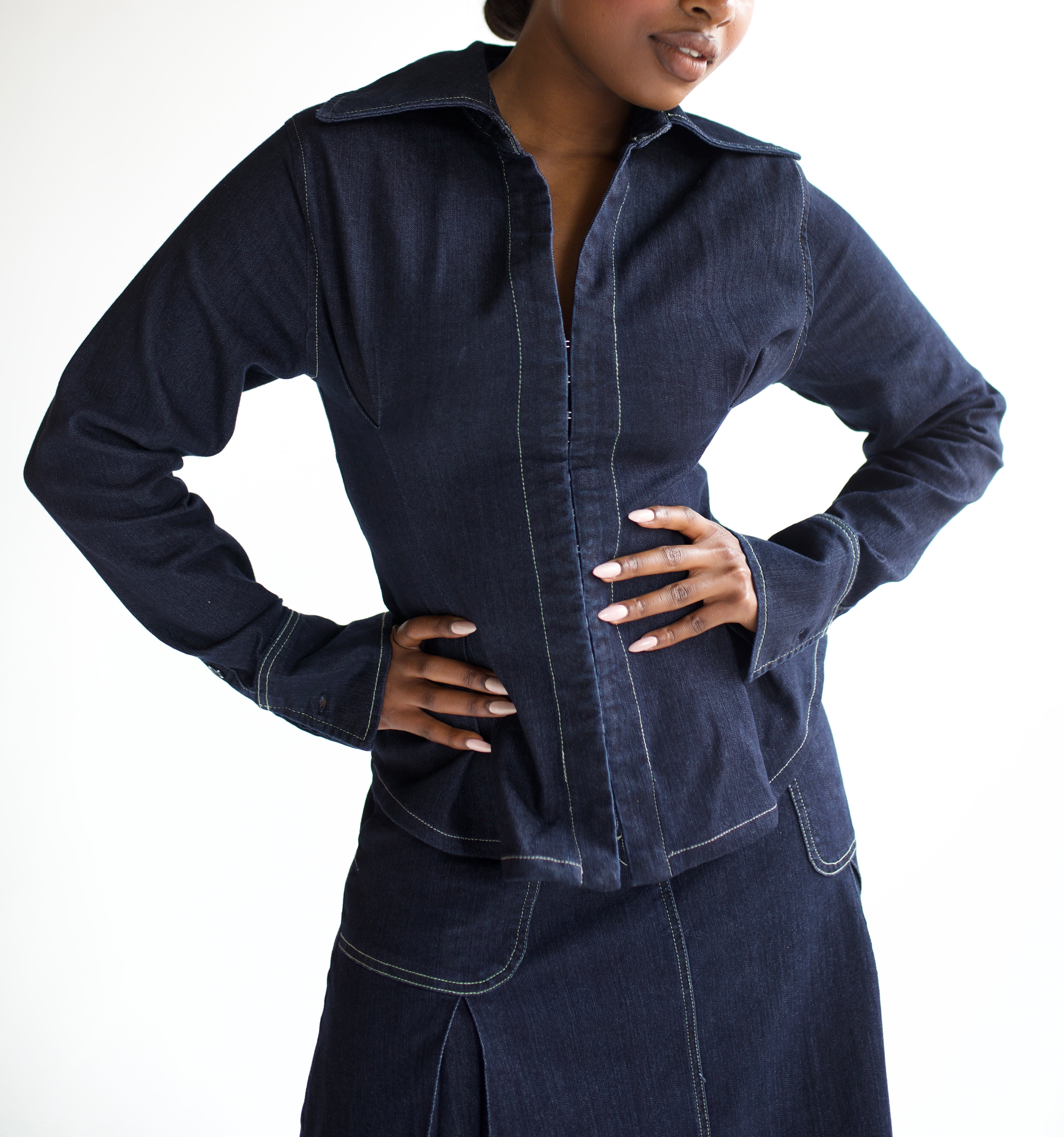 Introducing our elegant and timeless Snatch Denim Shirt, perfect for pairing with maxi skirts, dresses, or layering with our iconic denim maxi skirt. This feminine, flattering top offers exceptional comfort and features an hourglass shape that can be worn loosely or snatched for a stunning, elegant fit and flare.